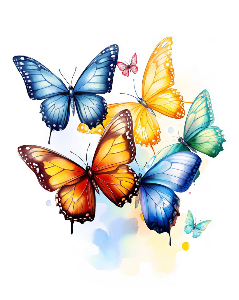 Using watercolor as a medium: first outline the contours of each butterfly, layer by layer blend the gradient colors of the butterfly wings to enhance their luster; Further depict details such as wing veins and spots to enhance texture; Finally, use softened strokes to create a light colored background, balancing the richness of the butterfly flock with the transparency of the image through color layering and light brushstrokes. Colorful Butterfly Trace-1