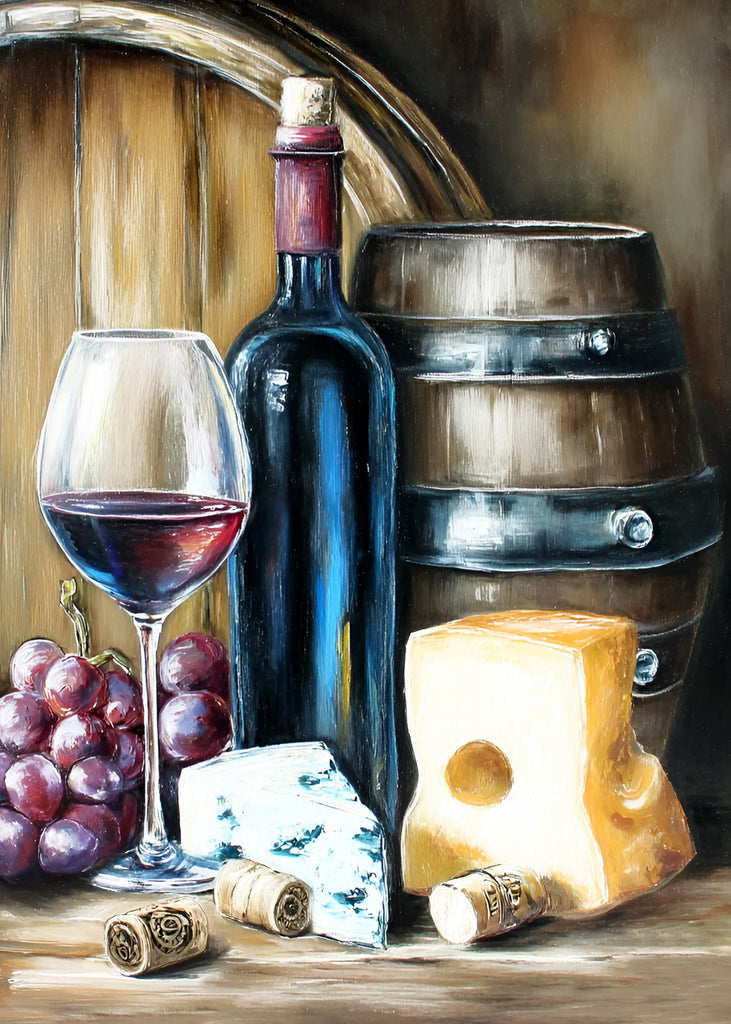 This painting takes wine themed still life as its core image, with tall glasses holding wine, deep wine bottles, plump purple grapes, and cheese of different textures, paired with vintage wooden wine barrels as the background. The colors are rich and the details are realistic, which not only restores the mellow texture of the wine tasting scene in the winery, but also conveys a leisurely and elegant living atmosphere. It is a concrete presentation of the "wine flavored life scene" and adapts to the retro warm spatial tone. The creative process first anchors the core atmosphere of the "vintage winery still life", selects elements such as red wine, grapes, cheese, and wine barrels, and clearly uses a realistic and delicate technique to restore texture; Next, lay out the background of the vintage wooden wine barrel, depict the texture and color of the wood, and create a rich scene base; Then depict the glass luster of the red wine bottle, the transparent texture of the tall glass, and the deep color of the wine in sequence; Subsequently, the plump form of purple grapes and the texture details of different cheeses were added to enrich the layering of the image; Finally, the transition between light and shadow and the connection of color of each element are reconciled to strengthen the sense of essence and consolidate the visual atmosphere of retro elegance.