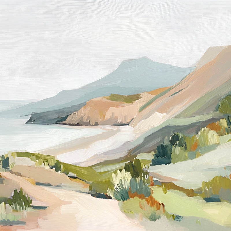 This artwork depicts a natural scene where the coast and mountains are interdependent, creating a fresh and soothing atmosphere with soft and warm colors and rhythmic color blocks. In the picture, undulating mountains stretch along the coast, vegetation adorns the slopes, and the colors of the sea and sky echo each other, conveying the beauty of natural tranquility and a peaceful state of mind as a whole. At the beginning of creation, first experience the natural atmosphere of the coastal mountains and capture the overall impression of light, shadow, and color interweaving. Subsequently, determine the composition and organize the spatial hierarchy and contour relationships of elements such as mountains, coasts, and vegetation. Starting from the overall color tone, lay out the basic colors of the sky, sea, and mountains, and gradually deepen. Through the superposition and connection of colors, enrich the texture of the mountains, the layers of vegetation, and the changes in light and shadow of the sea. Finally, adjust the overall rhythm of the screen to make each part harmonious and harmonious, and finally present the tranquility and vitality of the natural scenery.